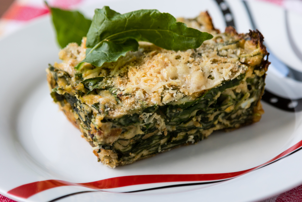Crema de leche y miga de pan forman la base cremosa para el queso parmesano y la espinaca, en esta versión sin mucho trabajo de un suflé tradicional. Servilo con papas y verduras baby cocidas al vapor.