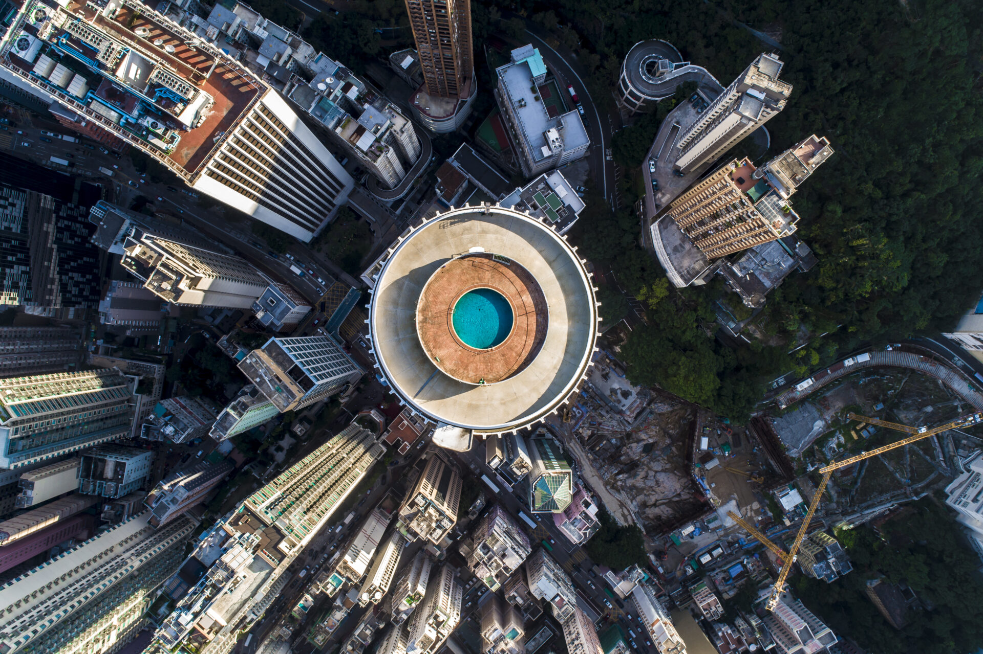 Aerial view of the Hopewell Centre, a landmark skyscraper in Wan Chai, Hong Kong Island. Known for its cylindrical design, the tower features a rooftop helipad, a revolving restaurant offering 360-degree city views, and a unique circular private swimming pool built for feng shui harmony, addressing public perception that the building resembled a cigarette. The scene captures the dense urban fabric of Hong Kong, blending architectural innovation with cultural beliefs in one of Asia’s most vertical cities.
